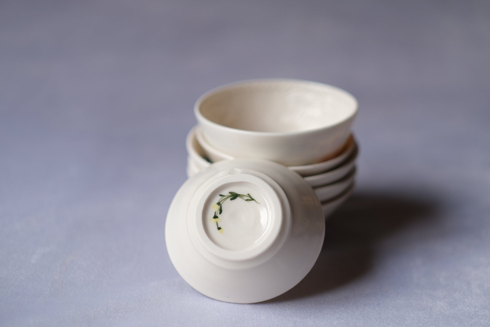 Palm-sized translucent porcelain bowl thrown extra thin, painted and carved with a pearled rim.