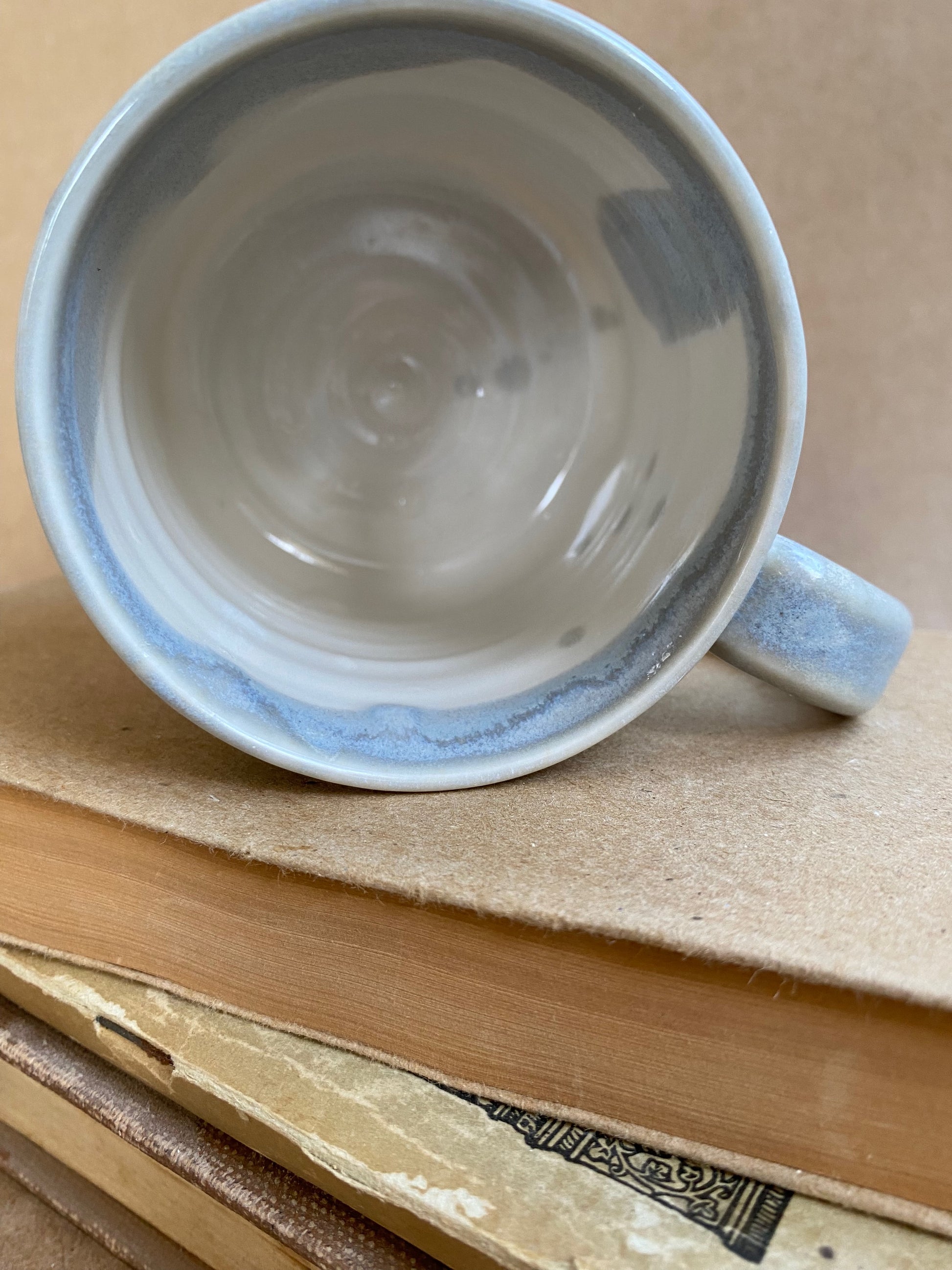 Wheel-thrown white porcelain mug with clear and cloud blue glaze.